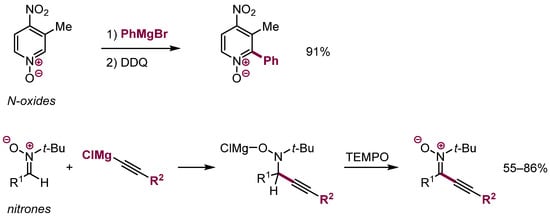 ONSH is also a well-established process for the functionalization of two structurally similar classes of π-electrophiles–aromatic N-oxides [,,] and aliphatic nitrones (Scheme 19) [,].