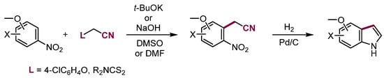Similar reaction proceeds with carbanions containing other leaving groups able to be eliminated in the base-induced E2 process. For example, VNS cyanomethylation of nitroarenes in the reaction with aryloxyacetonitriles is widely used to synthesize indoles (Scheme 21) [].