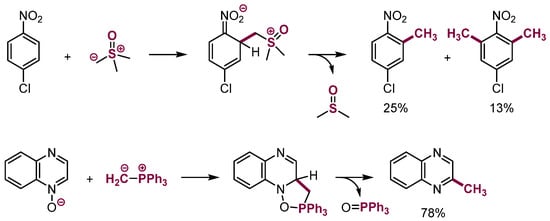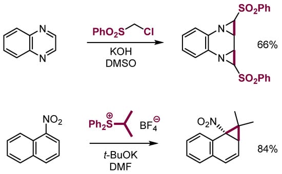 Interestingly, when delocalization of the negative charge in the σH adduct of α-halocarbanions or sulfonium ylides to electron-deficient arenes is inefficient, they react further not via β-elimination but via intramolecular substitution to form aziridines or cyclopropanes (Scheme 24) [,,,].
