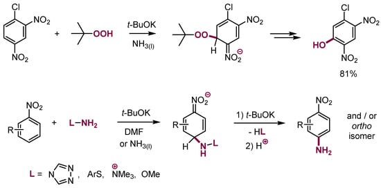 As previously mentioned, in p- and o-halonitrobenzenes and analogues there are also positions occupied by hydrogen available for the addition of nucleophiles. It should be stressed that addition of nucleophiles at these positions is, as a rule, faster than at positions occupied by halogen, but the σH adducts have no direct way for further conversion; hence, they usually dissociated. Nevertheless, when such a possibility exists, further conversion of the σH adducts results in nucleophilic substitution of hydrogen. The general picture is presented in Scheme 2 [,].