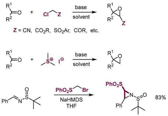 - Li, A.-H.; Dai, L.-X.; Aggarwal, V.K. Asymmetric Ylide Reactions: Epoxidation, Cyclopropanation, Aziridination, Olefination, and Rearrangement. Chem. Rev. 1997, 97, 2341–2372. [Google Scholar] [CrossRef] [PubMed]