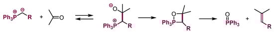 The high affinity of phosphorus to oxygen causes a different behavior of phosphonium ylides. Their anionic adducts to aldehydes and ketones react further via a combination of the O-anion with a positively charged phosphorous atom giving oxaphosphetanes, followed by the elimination of phosphine oxide to produce alkenes (Wittig reaction; Scheme 26). A similar reaction course leading to alkenes has been reported for adding phosphonium ylides to N-sulfonylimines [,], whereas simple N-arylimines give allenes [].