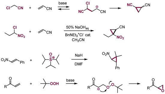 The addition of the nucleophiles containing leaving groups to electron-deficient alkenes results in the formation of anionic adducts that are γ-halocarbanions and related intermediates and is followed by intramolecular 1,3-substitution to give cyclopropanes. This is one of the major ways to synthesize substituted cyclopropanes (Scheme 27) [,,]. A similar process—addition followed by 1,3-intramolecular substitution reaction—proceeds between the anion of t-butylhydroperoxide and some electron-deficient alkenes to give oxiranes, although protonation of the intermediate adducts to form Michael-type products dominates []. Similarly, the addition of N-nucleophiles containing leaving groups followed by 1,3-intramolecular substitution is an efficient way of synthesis of aziridines [].