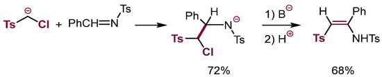 Surprisingly, there are no reports of the possibility of converting adducts of α-chlorocarbanions to aliphatic π-electrophiles containing a carbon-heteroatom double bond via base-induced β-elimination, although such attempts were disclosed in the literature []. Motivated by the similarity of aromatic and aliphatic π-nucleophiles reactivity, we have attempted such reactions. β-Elimination in the adducts of α-chlorocarbanions to benzaldehyde does not proceed as it is hampered by the vicinity of the negatively charged oxygen which engages in facile intramolecular substitution to form oxiranes. On the other hand, β-elimination in the adducts of α-chlorocarbanions to electron-deficient imines proceeded satisfactorily (Scheme 28) [].