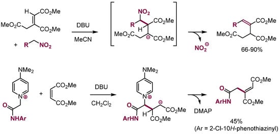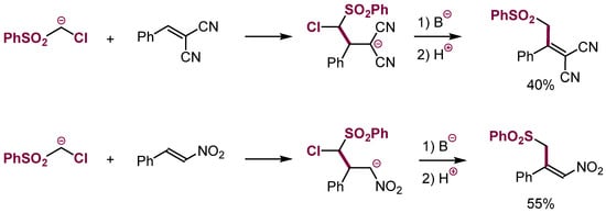 - Mąkosza, M.; Nizamov, S.; Kwast, A. Vicarious Nucleophilic Substitution of Hydrogen versus Vinylic Substitution of Halogen in the Reactions of Carbanions of Halomethyl Aryl Sulfones with Dialkyl Halofumarates and Halomaleates. Tetrahedron 2004, 60, 5413–5421. [Google Scholar] [CrossRef]