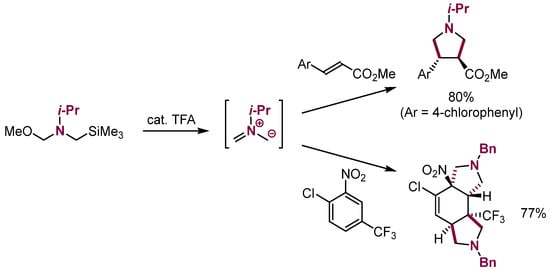 - Tang, S.; Zhang, X.; Sun, J.; Niu, D.; Chruma, J.J. 2-Azaallyl Anions, 2-Azaallyl Cations, 2-Azaallyl Radicals, and Azomethine Ylides. Chem. Rev. 2018, 118, 10393–10457. [Google Scholar] [CrossRef] [PubMed]
