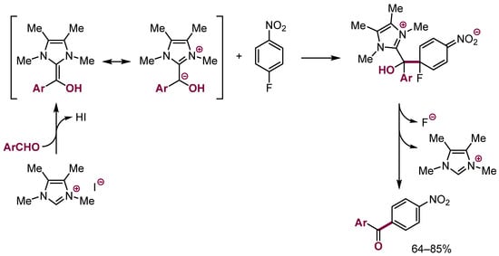 - Suzuki, Y.; Ota, S.; Fukuta, Y.; Ueda, Y.; Sato, M. N-Heterocyclic Carbene-Catalyzed Nucleophilic Aroylation of Fluorobenzenes. J. Org. Chem. 2008, 73, 2420–2423. [Google Scholar] [CrossRef] [PubMed]