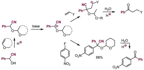 - Rad, N.; Mąkosza, M. Simple Synthesis of Aryl p-Nitroarylacetonitriles by Vicarious Nucleophilic Substitution with Carbanions of Protected Cyanohydrins. Eur. J. Org. Chem. 2018, 2018, 376–380. [Google Scholar] [CrossRef]