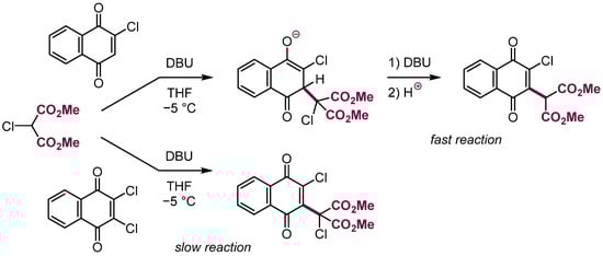 - Mąkosza, M.; Nizamov, S. Vicarious nucleophilic substitution of hydrogen (VNS) in 1,4-naphthoquinone derivatives—Competition between VNS and vinylic nucleophilic substitution (SNV). Tetrahedron 2001, 57, 9615–9621. [Google Scholar] [CrossRef]