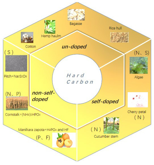 The previous studies indicated that in addition to the low cost of biomasses, the hard-carbon materials can also be produced from the plant and seafood wastes, as the plant and seafood wastes not only occupy public space but also cause environmental pollution, this method can also achieve resource conservation, environmental protection, and sustainable development. There are many scientists and engineers who have used low-cost biomasses to produce hard carbons [33]; however, when selecting biomasses for the preparation of negative electrode materials, in addition to the high C content of the material itself, we should also pay attention to its microstructure. It is necessary to screen the microstructure of the precursor, as the different biomasses generally have different microarchitectures [34]. Figure 2 shows the preparation strategies (un-doped, non-self-doped, and self-doped) of hard carbons from different biomasses. As an example, the microstructure of the most common cotton is a linear hollow fiber structure, and the radius is about 5–10 µm.