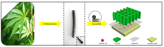 Direct pyrolysis of natural hemp haulm and assembly as a Na–ion battery [37], with copyright permission from Elsevier B. V.
