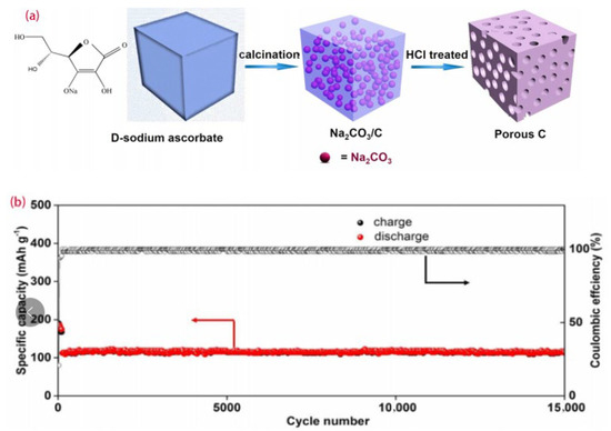 Because the three-dimensional pores not only provide access to the electrolyte but also slow down the volume expansion during the reactions, Wang et al. adopted the non-toxic D-sodium ascorbate as the carbon source to synthesize hard carbon with a three-dimensional layered porous structure. The synthesis process is shown in Figure 4a. The battery performance was optimal with a discharge capacity of 370 mAh/g at a low current of 0.2 A g−1, an initial Coulombic efficiency of up to 65%, and a capacity of about 110 mAh g−1 at 10 A g−1 after 15,000 cycles, as presented in Figure 4b [48].