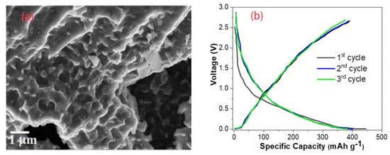 Acidified biomass can provide more active sites and improve the recycling performance. Acidified hard-carbon powders from hazelnut shells not only increased the initial Coulombic efficiency to 91%, but also resulted in very little capacity [62]. Double-atom doping not only enlarged the layer spacing and increased the active sites, but also had a good synergistic effect on the storage of Na ions [63]. Dutta used the natural biomass Manilkara zapota as a precursor to produce hard carbons. The SEM image and the first three cycles are shown in Figure 7. The doping of P and F elements resulted in a significant increase in the proportion of mesopores and micropores. At a current density of 0.1 A g−1, the cell was able to reach a capacity of 409 mAh g−1, and only 6 mAh g−1 was lost in the first cycle [64].