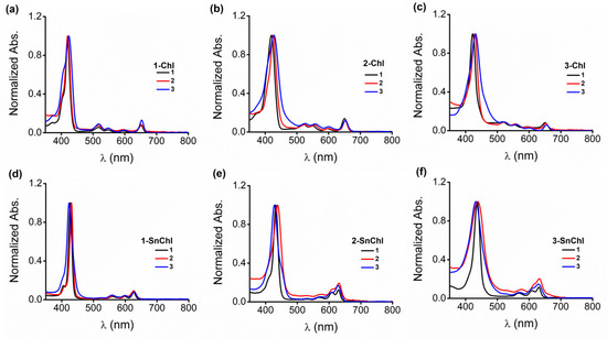UV-visible absorption spectra of (a) 1-Chl, (b) 2-Chl, (c) 3-Chl, (d) 1-SnChl, (e) 2-SnChl and (f) 3-SnChl in CHCl3 (1 black), DMSO (2 red), 1% DMSO-water (3 blue). Solutions were prepared at ca. 10 µM.