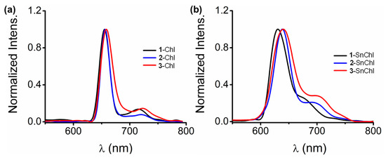 Fluorescence spectra of (a) 1-3-Chl and (b) 1-3-SnChl in DMSO. Solutions were prepared at ca. 0.2 µM and were excited at the B band maxima.