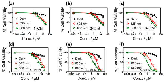 Cytotoxicity plots of MCF-7 cancer cells in the dark (black line) and under illumination for 20 min centered at 625 nm (red line) and 660 nm (green) with M625L3 and M660L4 Thorlabs LEDs, respectively, upon treatment with gradient concentrations of (a) 1-Chl, (b) 2-Chl, (c) 3-Chl, (d) 1-SnChl, (e) 2-SnChl and (f) 3-SnChl. The error bars represent the mean ± standard deviation of three independent assays each with three replicates.