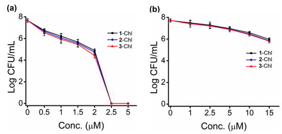 The cell viability plots for planktonic cells of (a) S. aureus and (b) E. coli upon treatment with gradient concentrations of 1-3-Chl after 45 min illumination with a Thorlabs M625L3 (240 mW·cm−2) LED. The error bars represent the mean ± standard deviation of three independent assays each with three replicates.