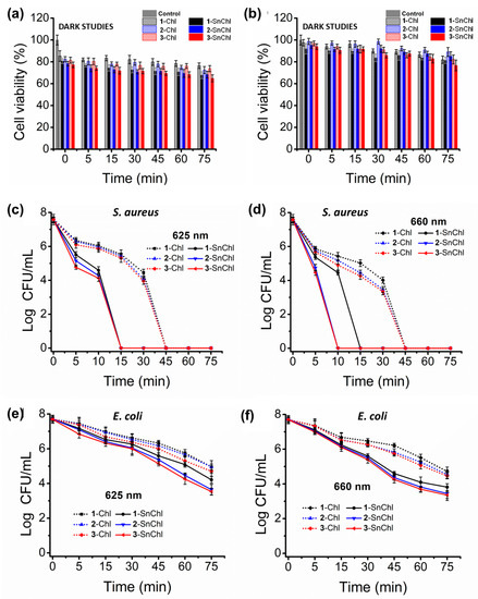 Cell viability plots for planktonic (a) S. aureus and (b) E. coli upon treatment with (a) 1 µM and (b) 5 µM of 1-3-Chl and 1-3-SnChl in the dark. Log10 reduction and cell survival values with (c,d) 1 µM and (e,f) 5 µM of 1-3-Chl and 1-3-SnChl against planktonic cells in 1% DMSO/PBS after illumination with Thorlabs M625L3 (240 mW·cm−2) and M660L4 (280 mW·cm−2) LEDs. The error bars represent the mean ± standard deviation of three independent assays each with three replicates.