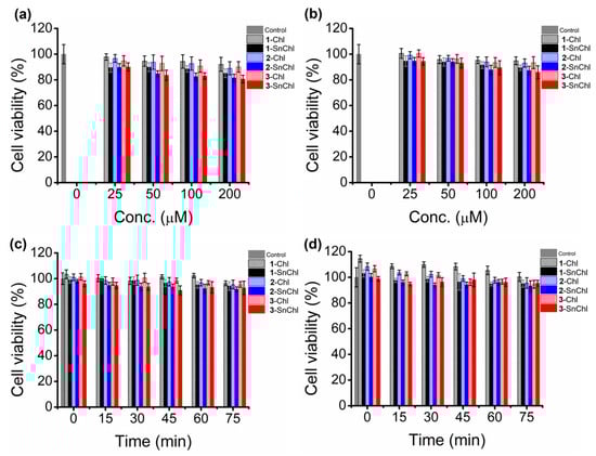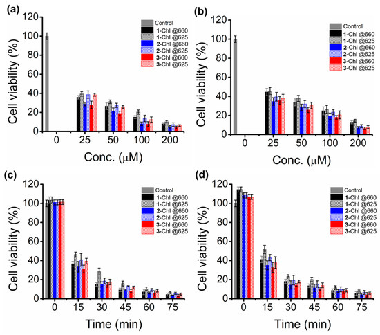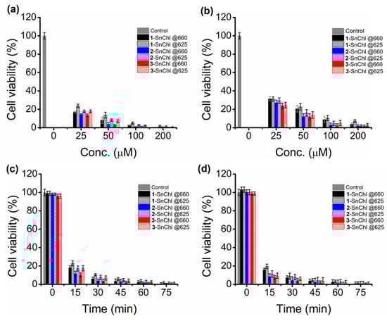 Optimal concentrations of 1 µM for S. aureus and 5 µM for E. coli were selected for use during time-dependent studies for 1-3-Chl and 1-3-SnChl based on concentration studies (Figure 4). Table 5 summarizes the time-dependent Log10 reduction values and cell survival values for 1-3-Chl and 1-3-SnChl toward planktonic cells of S. aureus and E. coli after photoirradiation with M625L3 and M660L4 Thorlabs LEDs.