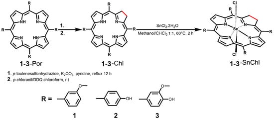 The second generation of PS dyes was mainly comprised of phthalocyanines, since their intense Q bands lie in the 650−700 nm range [4]. These dyes have solubility issues related to π-π stacking related aggregation, which can make their photophysicochemical properties less suitable for PS dye applications. Attempts have been made to address this by modifying the structures of PS dyes to enhance the singlet oxygen quantum yield (ΦΔ) and decrease aggregation effects. Chlorins (Scheme 1), such as chlorin e6 and Purlytin® [5,6,7], have emerged as PS dyes for PDT due to their relatively intense Q bands at ca. 650 nm [3,8,9]. In recent years, we have reported a series of studies on the PDT activity properties of the Sn(IV) complexes of readily synthesized porphyrin analogues [10], including N-confused porphyrins [11,12], corroles [13,14], and chlorins [15,16,17]. This research has focused on Sn(IV) complexes, since the presence of two axial ligands through trans-axial on the Sn(IV) ion hinders π-π stacking and hence aggregation, and the heavy atom effect of this ion enhances the generation of singlet oxygen [10].