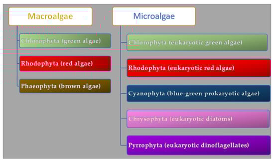 Algae are a group of photosynthetic organisms that differ in structure and size. They can grow in freshwater, marine water, deep oceans, and rocky shores. The bionetwork comprises 36,000 different kinds of algae. The seaweed macroalgae are multicellular organisms rich in lipids and proteins (40% and 71% of their dry weight) that can measure from a few centimeters to a meter, while the microalgae are microscopic unicellular carbohydrate-rich organisms [34]. Macroalgae are grouped in Chlorophyta (green algae), Phaeophyta (brown algae), and Rhodophyta (red algae) according to their pigment and chlorophyll profile (Figure 1).