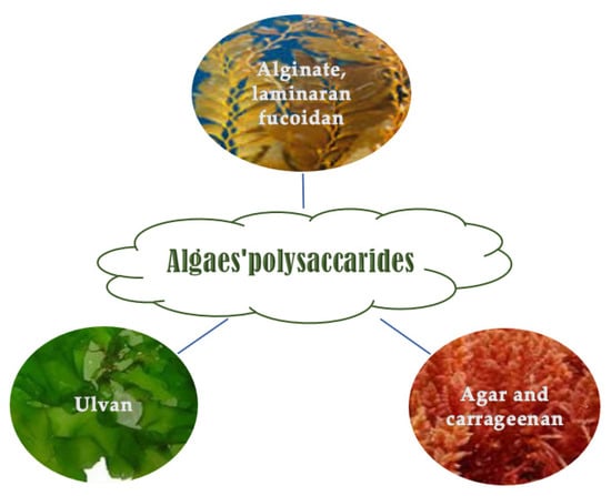 Marine macroalgae are good carbohydrate sources (mainly polysaccharides and low concentration of disaccharides and monosaccharides) whose content is from 5 to 75% (w/w, DW) based on the age, period, species, and harvesting site [52,53]. Polysaccharides in seaweeds can be sulfated and non-sulfated [54]. They constitute the algae cell walls and are species-specific (Figure 2) [55,56]. They have some technological, rheological, and biological activities. They can have a prebiotic effect and improve gut human microbiota performance [57].