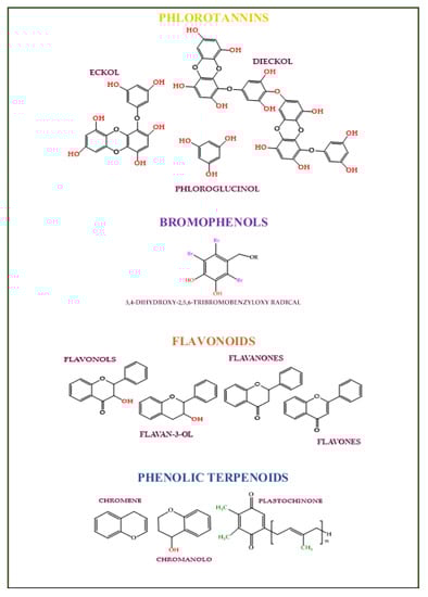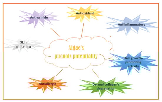 Phenolic compounds are secondary plant metabolites with one or more aromatic rings with one or more -OH phenolic groups (e.g., phlorotannins, bromophenols, flavonoids, phenolic terpenoid, and mycosporine-like amino acids) [130]. They can defend algae from pedoclimatic injuries and parasite attacks [131,132]. The biological activities attributed to the algae’s phenolic compounds are summarized in Figure 4 [133].
