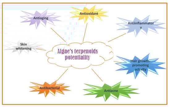 Mono- di- tri-and sesquiterpenoids were isolated from macro- and microalgae. Isoprenoid C5-subunits’ condensation forms terpenoids [191]. Terpenoids can act as antioxidants, antiaging (improving antioxidant enzymes such as catalase, superoxide dismutase, and glutathione peroxidase levels) [192], anti-inflammatory, skin-whitening (by inhibition of tyrosinase activity) [192], antibacterial (against gram-negative and gram-positive bacteria) [193], and anti-acne bioactive molecules (acting against Staphylococcus aureus, a gram-positive bacterium associated with acne vulgaris pathology) (Figure 6) [194,195].