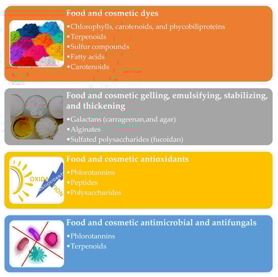 They are GRAS substances considered safe for human consumption by the European Food Safety Authority and the Food and Drug Administration [234]. The fucoidan (from U. pinnatifida and F. vesiculosus) was authorized by the European Commission (Regulation 2017/2470) in foods and food supplements [235]. The algal phlorotannins, peptides, and polysaccharides can protect the nutricosmetic formulation’s lipidic component from oxidative deterioration and maintain their original sensorial properties [236,237,238]. Finally, algae’s terpenoids and phlorotannins can be employed as preservative agents against bacteria and fungi [239].