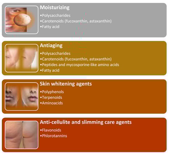 Algae’s metabolites in nutricosmetic products can be used as moisturizing, antiaging, skin whitening, anti-cellulite, and slimming care agents (Figure 8).
