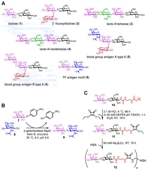 - Ohnuma, T.; Taku, T.; Nagatani, T.; Horii, A.; Imaoka, S.; Tanaka, T. Chemo-enzymatic synthesis of lacto-N-biose I catalyzed by β-1,3-galactosidase from Bacillus circulans using 4,6-dimethoxy-1,3,5-triazin-2-yl β-galactopyranoside as a glycosyl donor. Biosci. Biotechnol. Biochem. 2021, 85, 1716–1719. [Google Scholar] [CrossRef]
