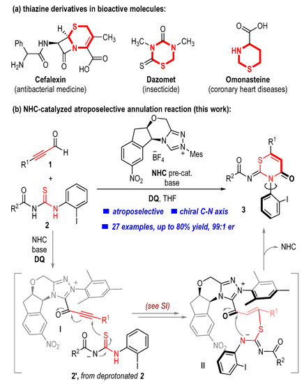 - Li, T.; Mou, C.; Qi, P.; Peng, X.; Jiang, S.; Hao, G.; Xue, W.; Yang, S.; Hao, L.; Chi, Y.R.; et al. N-heterocyclic carbene-catalyzed atroposelective annulation for access to thiazine derivatives with C-N axial chirality. Angew. Chem. Int. Ed. 2021, 60, 9362–9367. [Google Scholar] [CrossRef]