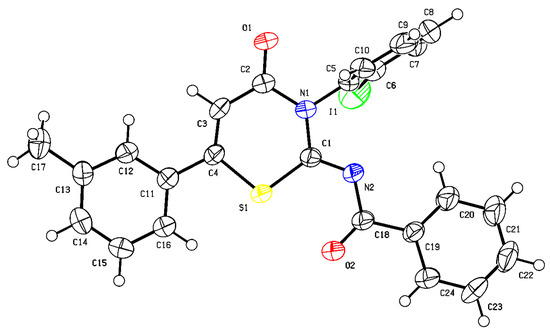 - (Z)-N-(3-(2-iodophenyl)-4-oxo-6-phenyl-3,4-dihydro-2H-1,3-thiazin-2-ylidene)-4-methylbenzamide (4a), yellow solid, 45% yield, 23.4 mg, m.p. 156–158 °C; = +16.1 (c = 1.0 in CHCl3); 1H NMR (400 MHz, CDCl3) δ 8.03 (dd, J = 8.0, 1.4 Hz, 1H), 7.71–7.68 (m, 4H), 7.57–7.49 (m, 4H), 7.33 (dd, J = 8.0, 1.6 Hz, 1H), 7.20 (td, J = 7.8, 1.6 Hz, 1H), 7.13 (d, J = 8.0 Hz, 2H), 6.92 (s, 1H), 2.36 (s, 3H); 13C NMR (101 MHz, CDCl3) δ 175.6, 161.9, 159.9, 151.7, 144.0, 141.4, 139.8, 134.4, 132.4, 131.8, 130.2, 130.1, 129.7, 129.4, 129.1, 126.8, 115.7, 98.1, 21.8; HRMS (ESI-TOF) m/z: [M + Na]+ calcd for C24H17IN2O2SNa 546.9948, found 546.9949; UPLC analysis: 93:7 er (OD-3 column, 25 °C, hexane/iPrOH = 80/20, 0.5 mL/min, λ = 254 nm), Rt (major) = 24.1 min, Rt (minor) = 32.6 min.