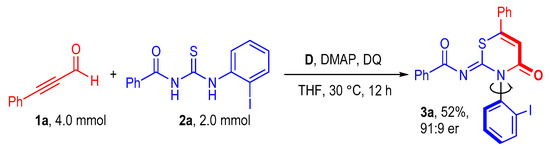 The alkynyl aldehyde 1a and benzoylthiourea 2a were selected as model substrates to evaluate the feasibility of the axially selective cyclization. A typical reaction mixture contained 1a (2 equivalents), 2a (1 equivalent), an NHC (20 mol%) as a catalyst, tetra-tert- butyldiphenylquinone (DQ, 2 equivalents) as the oxidant, and 4-dimethylaminopyridine (DMAP, 1.0 equivalent) as a base in furan as the solvent. Various aminoindanol-derived NHC precatalysts were evaluated (e.g., Table 1, entries 1–5). It was found that the NHC precatalysts bearing electron-rich N-aryl groups [55,56,57] could deliver the thiazine derivative 3a in lower yields with moderate optical purities (entries 1–2). On the contrary, the NHC precatalyst C [58] bearing an electron-poor N-C6F5 group gave only a trace amount of the desired product 3a (entry 3). Installation of a NO2 group (D) [59] or a Br group (E) [60] resulted in similar yields but with slightly improved enantioselectivity (entries 4–5). Then, the effects of base and solvent were explored by using D as the optimal NHC precatalyst. Replacing the DMAP with various organic or inorganic bases resulted in decreased yields, albeit with similar or slightly increased enantioselectivities (entries 6–8). The solvent was proved to have a significant impact on both the reaction outcome and enantioselectivity (entries 9–11). An acceptable yield and high enantioselectivity were obtained when tetrahydrofuran was used as a solvent (entry 9).