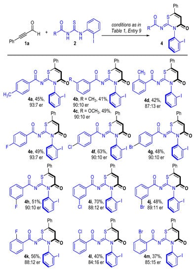 We then examined the scope of benzoylthiourea 2 using 1a as the model substrate. As disclosed in Scheme 2, both electron-donating (4a–4d) and electron-withdrawing (4e–4m) functional groups can be decorated on the benzene ring of benzoylthiourea 2 to produce the corresponding axially chiral thiazine-containing products with acceptable to good yields and enantioselectivities. Halide atoms including fluorine, chlorine, and bromine were all tolerated to afford halide atom-containing products, regardless of their substituted position (4e–4m). Such halide atom-substituted products provide opportunities for further transformations.