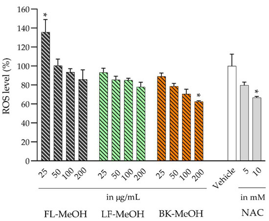 The excess accumulation of lipids in the 3T3-L1 cells can lead to the overproduction of ROS due to nicotinamide adenine dinucleotide phosphate (NADPH) oxidation [10], glucose autoxidation [11] and low-density lipoprotein (LDL) peroxidation [12]. Using a 2′,7′-dichlorodihydrofluorescein diacetate (DCFH-DA) fluorescent redox probe, our study found that the cellular ROS level in 3T3-L1 adipocytes was about 50% higher than that in undifferentiated 3T3-L1 cells. All methanolic extracts demonstrated a noticeable dose-dependent reduction in ROS. As shown in Figure 2, a decreasing trend for the adipocytes’ ROS was observed for all methanolic extracts. At 25 µg/mL, LF- and BK-MeOH decreased ROS levels by 7 and 11%, respectively. In contrast, at 100 µg/mL, FL-MeOH began to reduce the ROS level. At 200 µg/mL, BK-MeOH extract significantly decreased cellular ROS level by 37% compared to the untreated cells (control). The inhibition effect of BK-MeOH on cellular ROS was slightly better than that of NAC at 10 mM. In summary, the order of effects to reduce the accumulation of ROS can be ranked as BK-MeOH > LF-MeOH > FL-MeOH. The extracts’ ability to reduce the accumulation of ROS in 3T3-L1 adipocytes reflects and follows the same trend as their in vitro antioxidant activities found in our earlier finding [2]. These findings are consistent with the study by Elansary et al., which showed a correlation between ROS-scavenging effects and the strong antioxidative activities of their methanolic leaf extract (17 μg/mL) of A. saligna in various cancer cell lines [13].