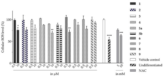 Isolated compounds, such as (−)-epicatechin 6, quercitrin 4, and myricitrin 8, showed potent antioxidant activities against DPPH and ABTS free radicals [2]. This suggests that the potent antioxidant activities of these compounds may also affect the accumulation of ROS and help explain the observed reduction in the accumulation of ROS by the extracts. The ability of isolated compounds to reduce cellular ROS was evaluated using the same protocol used to evaluate the extracts. Figure 3 and Supplementary Table S3 present the result of the DCFH-DA assay on the cells treated with 0.5 and 10 µM of the isolated compounds. Compared to the vehicle control, there was a reduction of about 10% in the ROS level achieved by 5a and 5b at 0.5 µM. In contrast, the ROS level was relatively unchanged for the other isolated compounds. A noticeable decrease was found when using 10 µM of the two compounds isolated from BK-MeOH extract, (−)-epicatechin 6 and D-(+)-pinitol 5a, indicating that they were the most active compounds, with reduction percentages of 29% and 31%, respectively. D-(+)-pinitol 5a demonstrated more activity than its enantiomer, (−)-pinitol 5b, consistent with the previous finding on DPPH and ABTS scavenging [2].