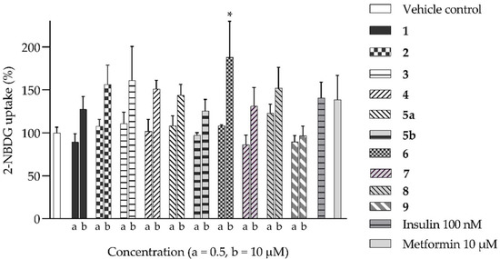 2-NBDG uptake by 3T3-L1 adipocytes treated with isolated compounds. * p = 0.01, p value was from the indicated sample against the vehicle control (n = 3, one-way ANOVA, with Dunnett’s post hoc tests). a = 0.5 µM, b = 10 µM. Compound 1 = naringenin, 2 = naringenin-7-O-α-L-arabinopyranoside, 3 = isosalipurposide, 4 = quercitrin, 5a = D-(+)-pinitol, 5b = (−)-pinitol, 6 = (−)-epicatechin, 7 = 2,4-di-tert-buylphenol, 8 = myricitrin, and 9 = 3-hydroxy-5-(2-aminoethyl) dihydrofuran-2(3H)-one).