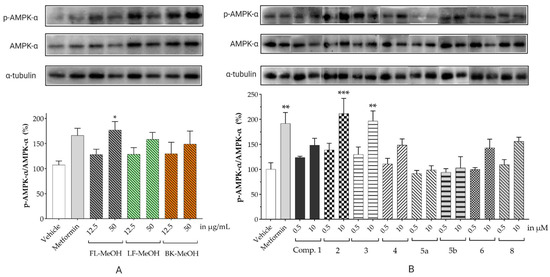 The ratio of expressed p-AMPK-α to AMPK-α in 3T3-L1 adipocytes treated with MeOH extracts (A) and isolated compounds (B). Data in mean ± SEM; * p = 0.02; ** p = 0.003, *** p = 0.0002, p values were from values of indicated samples vs. the vehicle control (n = 3, one-way ANOVA, with Tukey’s post hoc tests). Comp., 1 = naringenin, 2 = naringenin-7-O-α-L-arabinopyranoside, 3 = isosalipurposide, 4 = quercitrin, 5a = D-(+)-pinitol, 5b = (−)-pinitol, 6 = (−)-epicatechin, and 8 = myricitrin).