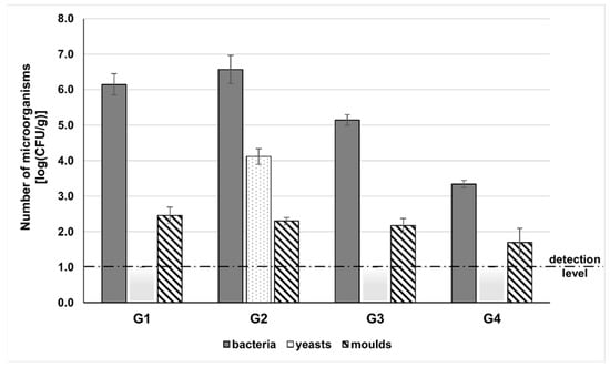 The level of microorganisms contaminating goji berries of various origins: G1—natural dried goji berries from China, packed in Poland; G2—freeze-dried goji berries from Poland; G3—natural dried goji berries from Ningxia, China; G4—freeze-dried goji berries from Ningxia, China.