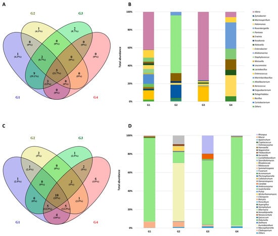 Venn diagram showing the overlap of bacterial genera and the relative abundance of major bacterial genera (percentage of the total OTUs) (A,B) and fungal genera (C,D) in goji berries of various origins: G1—natural dried goji berries from China, packed in Poland; G2—freeze-dried goji berries from Poland; G3—natural dried goji berries from Ningxia, China; G4—freeze-dried goji berries from Ningxia, China.