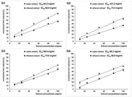 Consequently, freeze-dried fruits grown in Poland (G2) were characterized by the lowest ability to neutralize ABTS•+ radicals. The IC50 values were 121.2 mg/mL for the water extract and 73.4 mg/mL for the ethanol extract (Figure 3). The highest neutralizing activity was found in natural dried goji berries from China, packed in Poland (G1). As with antioxidant capacities, a higher ABTS radical-scavenging activity was found in ethanol extracts than in water extracts.