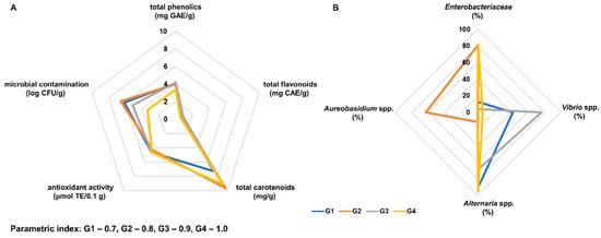 Overall, the dried goji fruits available on the Polish market were heterogeneous. The berries originating from China and packed in Poland (G1) were characterized by statistically lower content of carotenoids compared to fruits cultivated in Poland and the most valued goji from the Ningxia region (Figure 4A). Although no statistically significant differences were found between the examined goji in the content of polyphenols and flavonoids, the fruits cultivated in Poland (G2) were characterized by statistically lower antioxidant activity. Distinct differences were observed in the level of microbial contamination and the structure of the dominant microbiota. However, the structure of the microbiota was more strongly dependent on the preservation method than the region of goji cultivation. The dominant group of bacteria in the natural dried fruits from China (G1 and G3) was Vibrio spp., and in the freeze-dried berries grown in Ningxia (G4) and in Poland (G2) the Enterobacteriaceae family dominated. Alternaria spp. molds were dominant in all goji fruits originating from China (G1, G3, and G4), while in berries cultivated in Poland (G2) Aureobasidium spp. prevailed (Figure 4B). The high amount of microorganisms in goji available in Poland (G1 and G2) is worrying and may raise concerns in terms of consumer safety. Goji berries from the Ningxia region showed the highest microbial quality and biological activity (Figure 4A). The parametric indexes determined for fruits originated from Ningxia were 0.9 for natural dried berries (G3) and 1.0 for freeze-dried berries (G4), reaching the maximum value for this index. The lowest index value was calculated for natural dried goji berries from China packed in Poland (G1), at 0.7 (Figure 4).