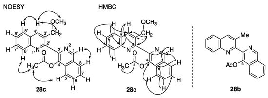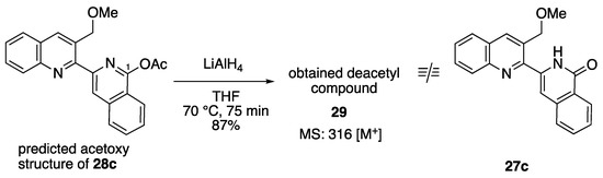 During our Reissert–Henze-type reaction optimization studies, because of our work on the synthesis of alangiumkaloids (Scheme 1), we predicted that the obtained acetoxy 28c was the 1-acetoxyisoquinoline product (Scheme 5). Therefore, we attempted to remove the acetyl group of 28c by LiAlH4 reduction. However, the 1H-NMR spectra of the obtained compound 29 did not match that of isoquinolone 27c. Further 2D-NMR studies (heteronuclear multiple-bond correlation (HMBC) and nuclear Overhauser effect spectroscopy (NOESY) measurements) were performed to verify the structure of the obtained 28c. The through-space proton interaction correlations are shown in Figure 2. In particular, 28c was identified as 4-acetoxyisoquinoline because the NOESY correlation of the methyl protons (2.13 ppm) of the acetyl group to C5-H (7.98 ppm) and C8’-H (8.13 ppm) was observed. Consequently, compound 29, obtained from 28c reduction, was confirmed to be 4-hydroxy-3-(3-methoxymethylquinolin-2-yl)isoquinoline and compound 28b was also confirmed to be 4-acetoxyisoquinoline. The formation of both the 4-acetoxyisoquinoline product together with the isoquinolone product has been reported by Robison and co-workers [37]. However, why the Reissert–Henze-type reaction of our N-oxide 26 afforded 4-acetoxyisoquinoline remains to be elucidated. In the future, we will investigate this phenomenon in greater detail.