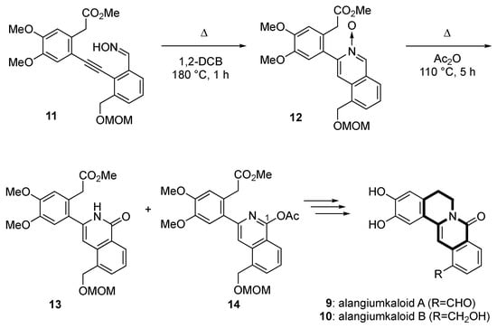 Recently, we developed a versatile synthetic route to produce 8-oxoprotoberberine alkaloids (alangiumkaloids A (9) and B (10)) through the synthesis of isoquinolone and via B-ring construction [34] (Scheme 1). The key step in this was the synthesis of isoquinolone 13 through the thermal cyclization of 2-alkynylbenzaldehyde oxime 11 to afford isoquinoline N-oxide 12, followed by a Reissert–Henze-type reaction. The lithium aluminum hydride (LiAlH4) reduction of both the obtained isoquinolone 13 and 1-acetoxyisoquinoline 14, followed by quinolizidine ring construction (B-ring formation), completed the first total synthesis of alangiumkaloids 9 and 10. Employing this strategy, we also synthesized a series of alangiumkaloid analogs and are currently conducting exploratory antitumor activity research into these compounds.