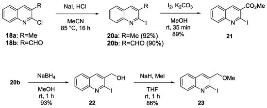We began the synthesis of three quinolines (AB-ring) in possession of the necessary substitutions, as shown in Scheme 3. The starting materials, 2-chloroquinolines 18a and 18b, were synthesized from acetanilide according to the method of Bhuyan and co-workers [35]. Subsequently, 2-chloroquinolines 18a and 18b were heated with NaI and concentrated HCl in acetonitrile (MeCN) to obtain 2-iodoquinolines 20a and 20b at 92% and 90% yields, respectively [36]. Treatment of 20b with iodine and K2CO3 in methanol (MeOH) provided methyl ester 21 at an 89% yield. Alternatively, the reduction of 20b with NaBH4 followed by hydroxy group methylation provided 3-methoxymethylquinoline 23 at an 80% yield over 2 steps.