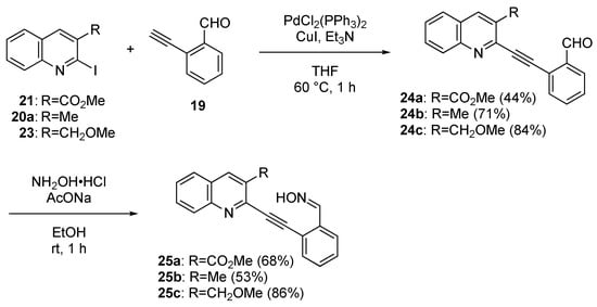 Next, we prepared the key isoquinolone synthesis precursors: 2-alkynylbenzaldehyde oximes 25 (Scheme 4). The Sonogashira reaction of 2-iodoquinolines 21, 20a, and 23 with 2-ethynylbenzaldehyde 19 in the presence of CuI, triethylamine (Et3N) and bis(triphenylphosphine)palladium(II) chloride (PdCl2(PPh3)2) provided 2-alkynylbenzaldehydes 24a, 24b, and 24c at 44%, 71%, and 84% yields, respectively. The treatment of 24a–c with hydroxylamine produced oximes 25a–c at 68%, 53%, and 86% yields, respectively.