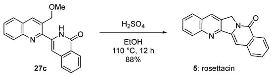 To complete the synthesis of rosettacin (5), we applied the conditions reported by Ciufolini and co-workers for C-ring formation [38]. Heating 27c with H2SO4 in ethanol (EtOH) produced 5 at an 88% yield (Scheme 6). Thus, the total synthesis of rosettacin (5) was achieved through an eight-step sequence at a 23.8% overall yield.