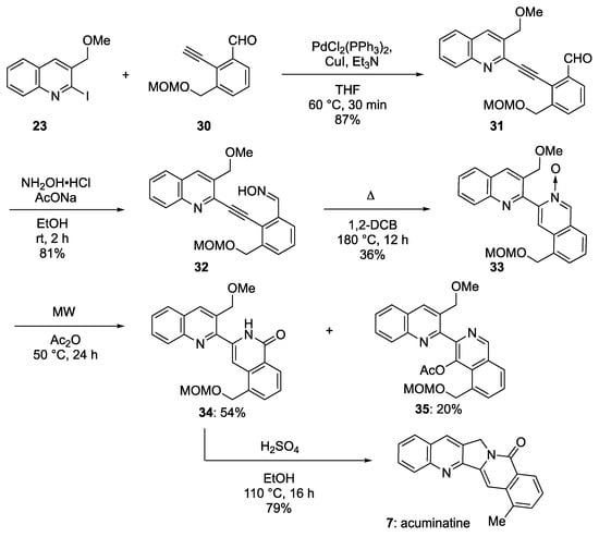 As described above, we established a method for the synthesis of benz[6,7]indolizino[1,2-b]quinolin-11(13H)-one, which is the core structure of compounds in the aromathecin family. Next, we tried to synthesize 22-hydroxyacuminatin (6) by applying the same methodology (Scheme 7). Sonogashira coupling of 2-iodoquinoline 23 and 2-ethynylbenzaldehyde 30 in the presence of CuI, Et3N and PdCl2(PPh3)2 produced 2-alkynylbenzaldehyde 31 at an 87% yield. The treatment of 31 with hydroxylamine in EtOH produced 2-alkynylbenzaldehyde oxime 32 at an 81% yield. Subsequently, heating 32 in 1,2-DCB at 80 °C did not deliver the isoquinoline N-oxide cyclization product 33. Instead, the treatment of 32 in 1,2-DCB at 180 °C produced 33 at a 36% yield. Next, heating 33 in Ac2O at 50 °C under MW irradiation produced the desired isoquinolone 34 and 4-acetoxyisoquinoline 35 at yields of 54% and 20%, respectively. Finally, when 34 was heated with H2SO4 in EtOH, the desired 22-hydroxyacuminatine (6) was not produced, but acuminatine (7) was isolated at a 79% yield. The formation of 7 is believed to have proceeded with dehydroxylation after the removal of the MOM group along with scaffold formation. The physical and spectroscopic data for our synthetic rosettacin (5) were consistent with previously reported values in all respects [26]. Furthermore, 1H-NMR, 13C-NMR, and mass spectroscopy characterization of all our synthetic compounds supported the identified structures, the details of which can be found in the Supporting Information section.