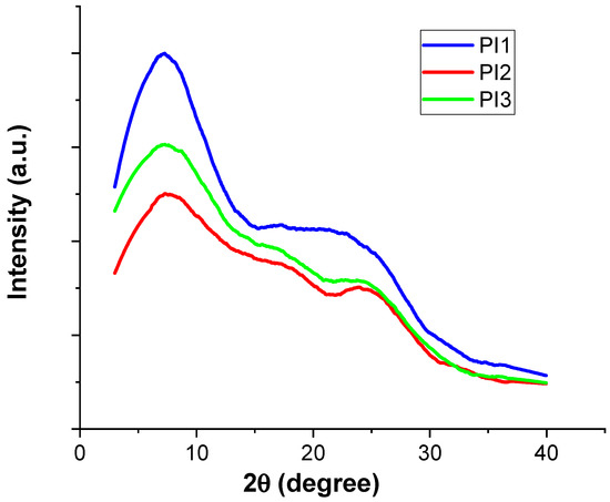 Due to the black appearance of the polyimide powders (as can be seen in Scheme 1), XRD measurements were registered to analyze the possible crystalline nature of the polymers. The broad X-ray diffractogram of the polyimides (Figure 3) in the range of 15–25° indicate their amorphous nature. The two overlapped halos identified in this region may be associated with the mixture of the two polymer structures, i.e., polyimide and polyamidic acids. The peak found at smaller diffraction angles in all polyimides (approx. 7°) is tentatively attributed to the changes in local order (regular repeating distances), i.e., short-range regular packing of polymer chains with no crystalline features [49]. The amorphous nature of these polyimides is due to the presence of the bulky unsymmetrical DOPO-substituted triazine moiety in the diamine segment and of flexible units (ether, hexafluoroisopropylidene, or isopropylidene) in the diimide segment. All of these structural units disturb the overall regularity and hinder the arrangement in crystalline domains of polyimide chains [50].